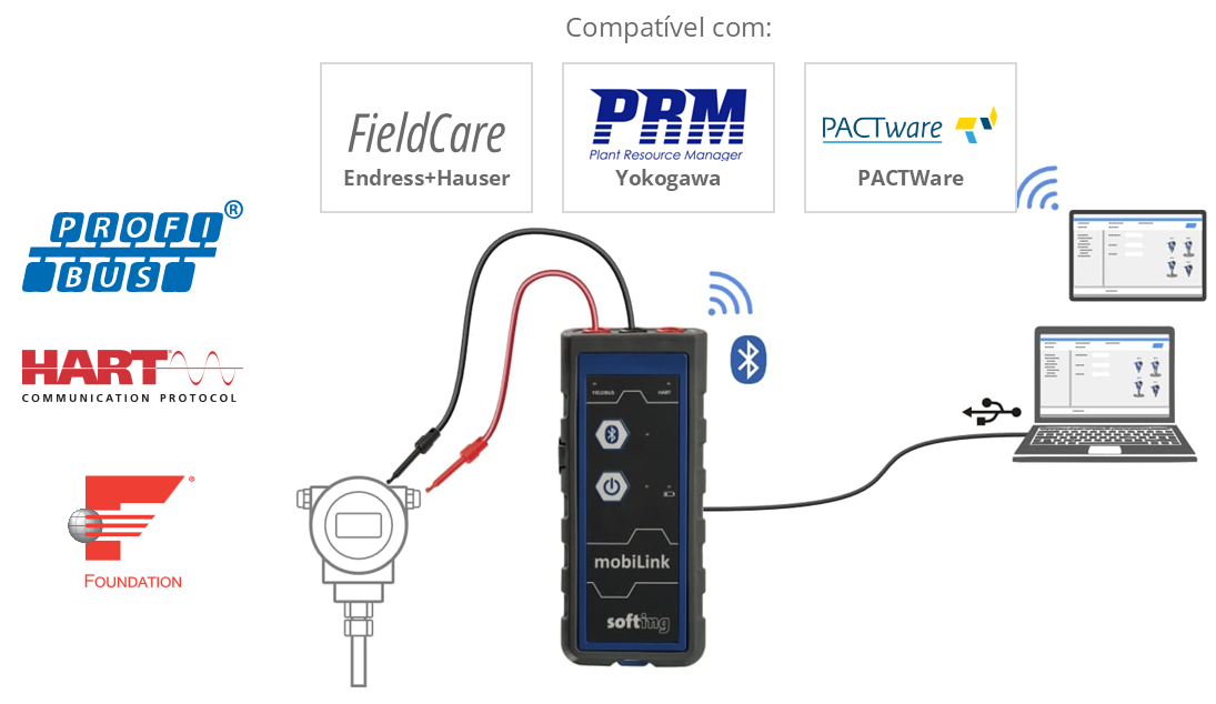 O mobiLink é uma solução compacta que centraliza a configuração e o comissionamento de instrumentos PROFIBUS PA, HART e FOUNDATION Fieldbus em um único equipamento.