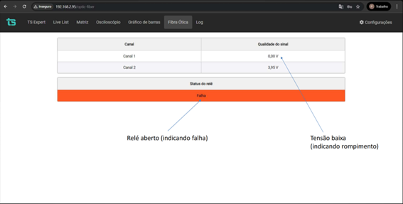 Figura 2: Tela de monitoramento com indicação de falha no link óptico, incluindo relé aberto e baixa tensão