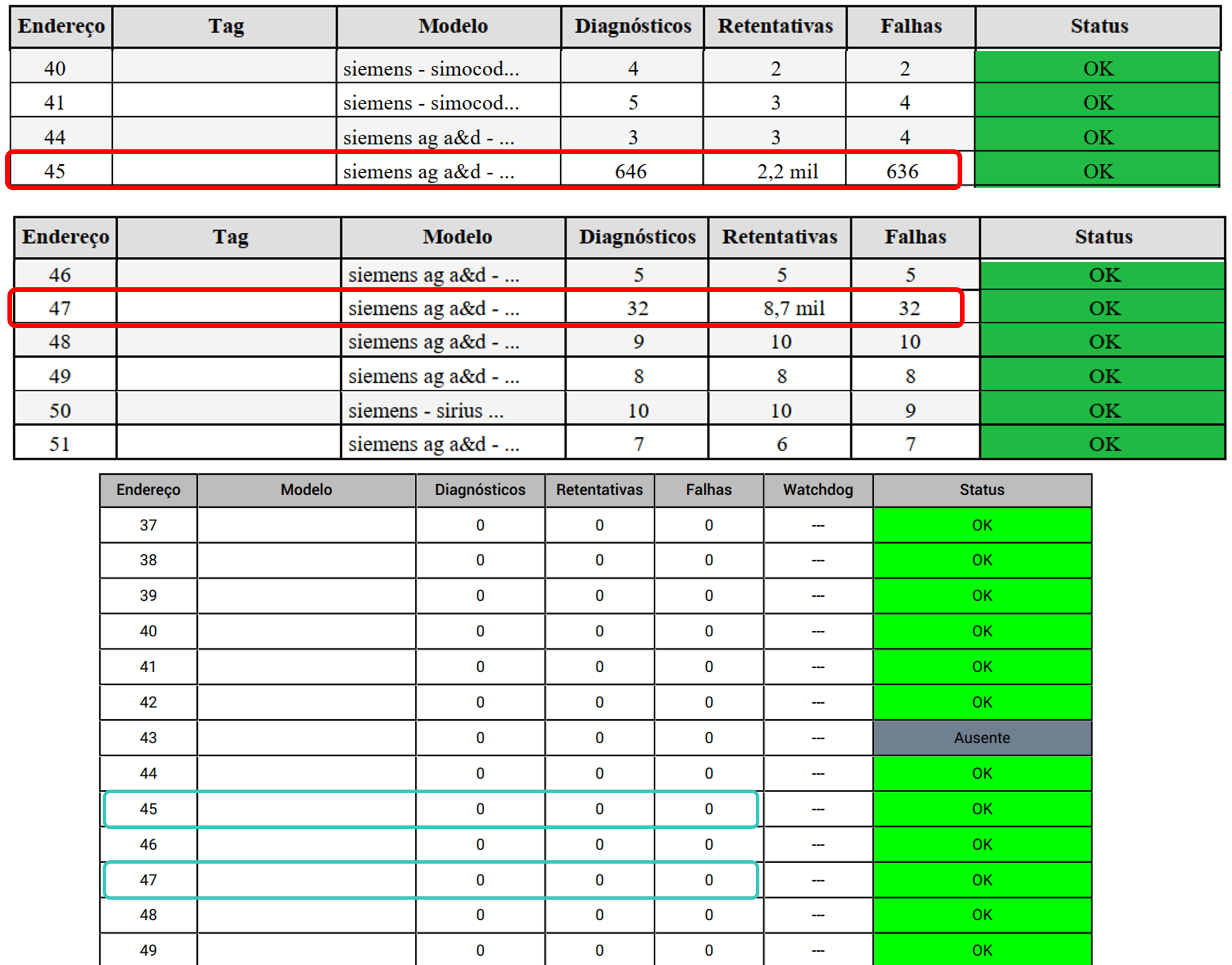 Com base nos dados coletados, foi possível identificar escravos com falhas nas placas de comunicação, além de fazer inspeções visuais que detectaram problemas de conexão em diversos pontos da rede.