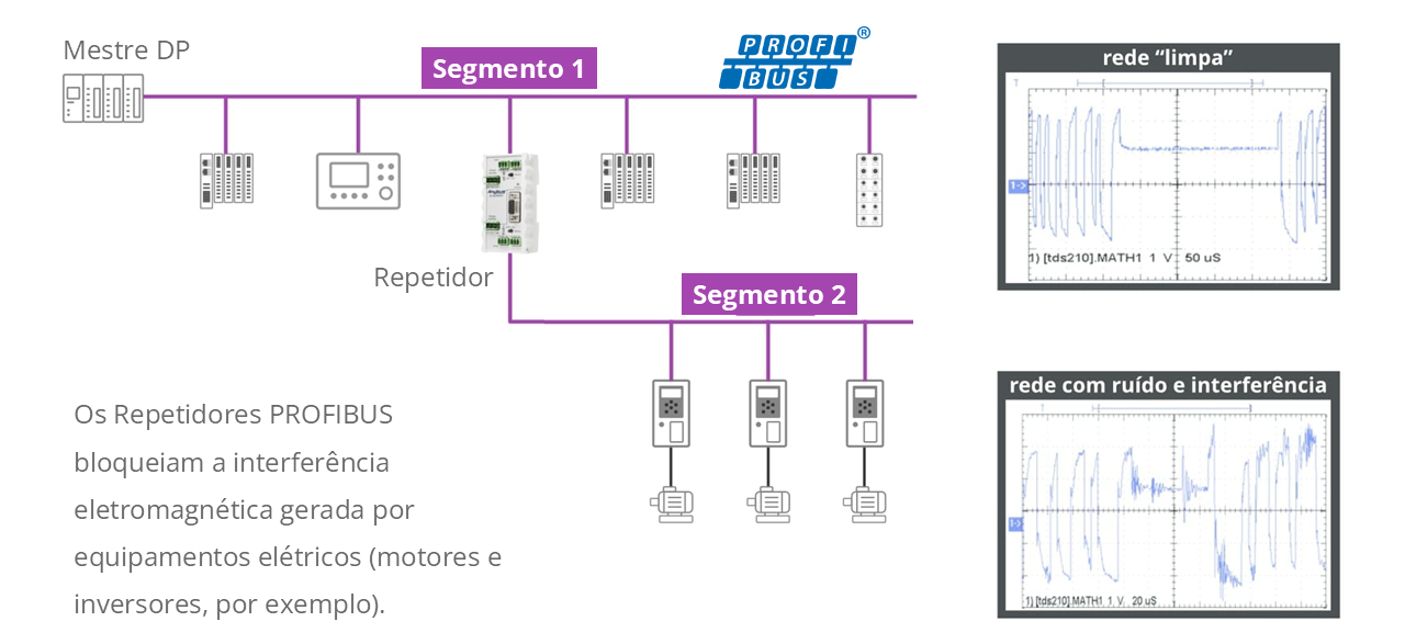 Os Repetidores PROFIBUS DP segmentam o barramento e isolam eletricamente os dois trechos da rede, aumentando a robustez da comunicação em processos industriais.