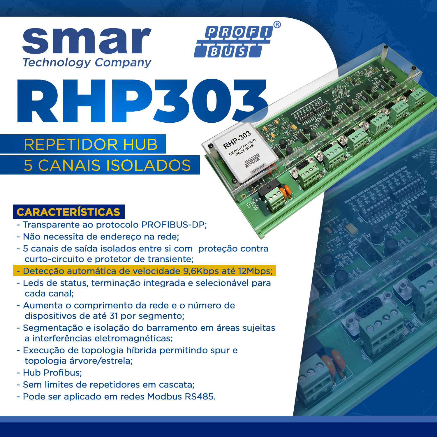 RHP303 é um elemento ativo que serve de interface entre segmentos de rede PROFIBUS e que assegura níveis adequados de sinais, garantindo a integridade do sinal de comunicação. O repetidor evita a deterioração do sinal em longas distâncias.
