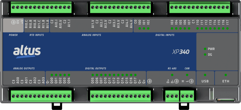 O modelo XP340 é uma solução compacta e de alta densidade de E/S, projetada para aplicações stand-alone e distribuídas. Seu design para montagem em trilho DIN o torna perfeito para espaços limitados em painéis de controle. O XP340 também conta com suporte a WebServer, ferramenta que permite a criação de telas de supervisão e monitoramento de aplicação sem a necessidade de usar um sistema SCADA.